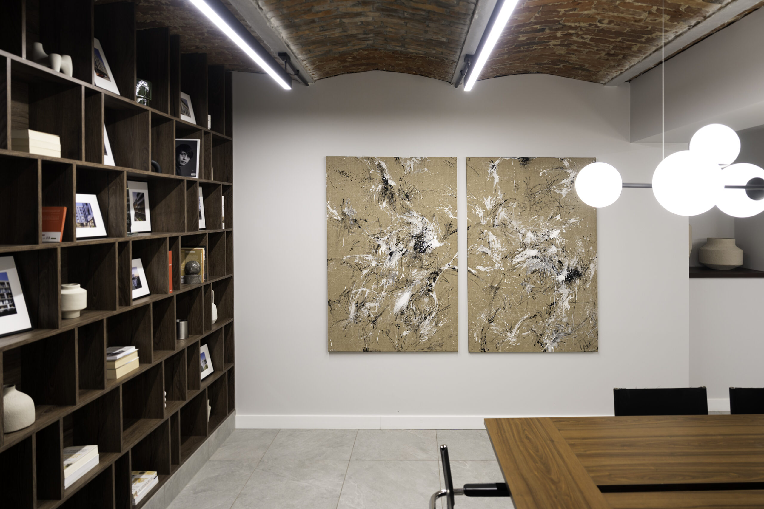 Obraz „Dirty Dancing” (2 x 150 x 100 cm) to pełna ekspresji abstrakcyjna kompozycja, która natychmiast przyciąga uwagę swoją intensywnością i chaotycznym ruchem. Na surowym, neutralnym tle widoczne są dynamiczne, białe i czarne pociągnięcia pędzla oraz rozpryski farby, które tworzą wrażenie żywiołowości. Linie, plamy i smugi zdają się splatać w wirujący taniec, tworząc napięcie i rytm na powierzchni płótna. Całość emanuje spontanicznością, a chaotyczne plamy farby nadają pracy surowy, nieuporządkowany charakter.